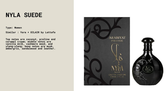 Experience the luxurious blend of NYLA SUEDE WOMEN EDP - 80ML BY ARABIYAT PRESTIGE. With top notes of coconut, praline, and caramel cream, indulge in the sweet scent of the tropics. The heart notes of vanilla milk, cashmere wood, and ylang-ylang offer a warm and rich aroma. Finally, the base notes of musk, ambergris, sandalwood, and leather provide a sophisticated and sensual finish. Elevate your fragrance game with this exquisite perfume.