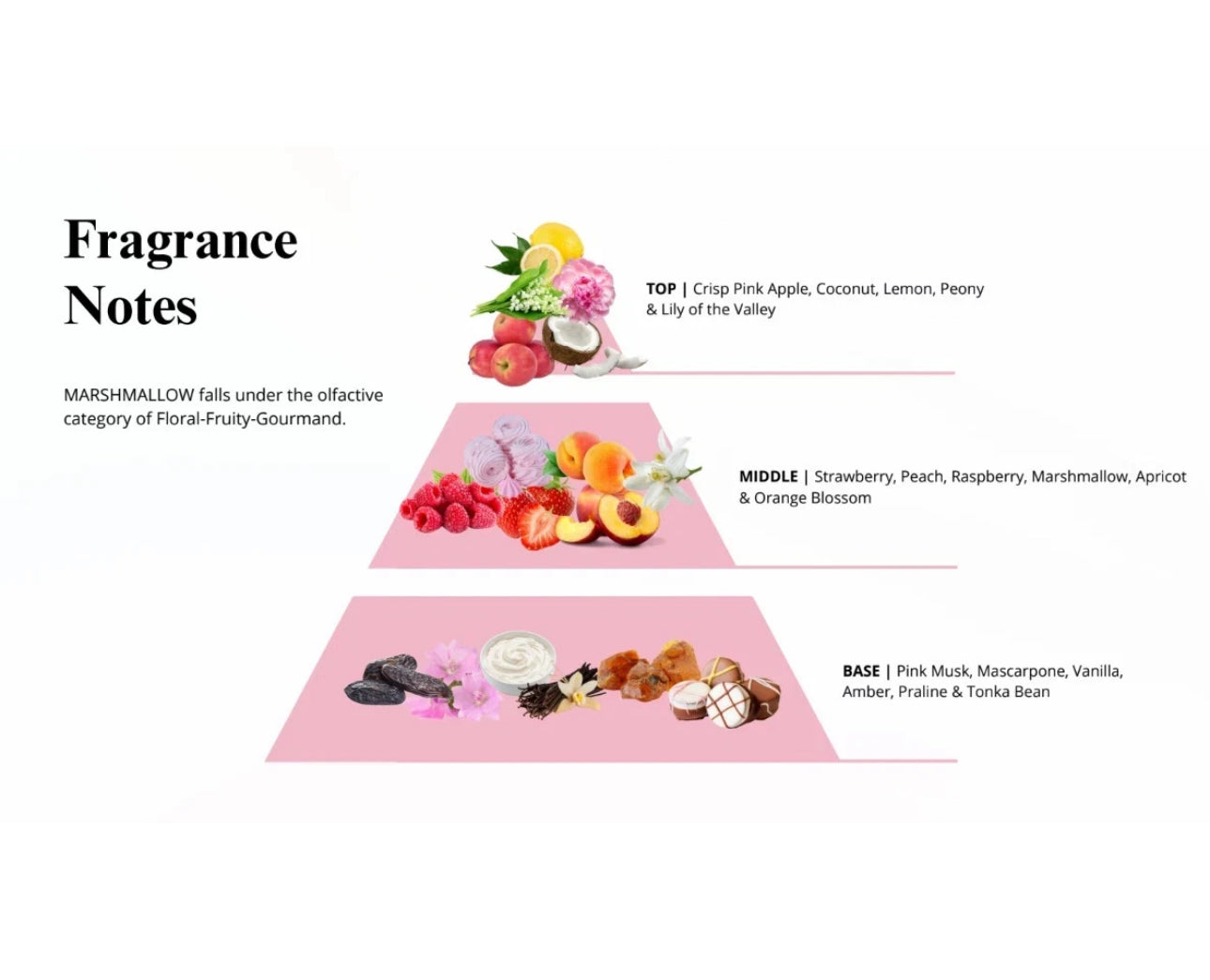 Experience the Allure:Odyssey Marshmallow opens with a bright and juicy burst of pink apple and lemon, softened by creamy coconut and delicate florals of peony and lily of the valley. The heart is playful and indulgent, where strawberry, peach, and raspberry blend with marshmallow and apricot, creating a deliciously sweet yet vibrant bouquet.