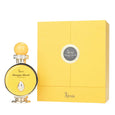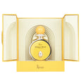 LUXURY GOLDEN GIFT BOX PACKAGING Presented in a premium textured yellow box with gold foil, floral-golden interior artwork, and an ornate gold arch framing the bottle — a true collector’s piece.