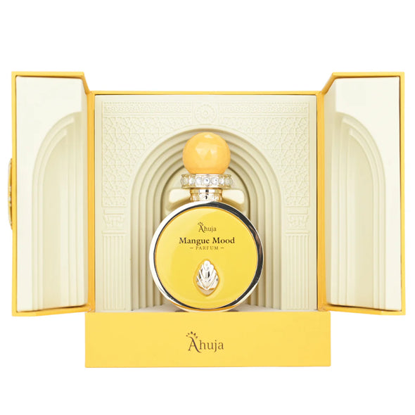 AHUJA – MANGUE MOOD | “Some moods stay golden.” Mangue Mood is a celebration of golden moments — lush, bright, and smooth as sun-warmed skin. Inspired by the richness of Alphonso mango, it opens with a juicy, addictive burst of mango accord blended with apple, bergamot, lemon, and a spark of cardamom. The heart blooms into creamy tuberose, delicate lily of the valley, and sweet mandarin, creating a glowing floral swirl that feels tropical and soft, like fruit warmed by sunlight. As the scent settles, sandalwood, amber, and white musk melt into a warm, fluid dry down — silky, comforting, and beautifully radiant. Crafted with 35% organic/natural parfum oils, Mangue Mood lasts long on the skin while keeping its fruity-floral softness. Presented in a striking golden-yellow luxury box, embossed and lined with floral gold artwork, the bottle rests inside an ornate gold chamber — making this not just a fragrance, but a statement of mood and brightness. Mangue Mood is the texture of joy, the radiance of calm, and the sweetness of being seen.