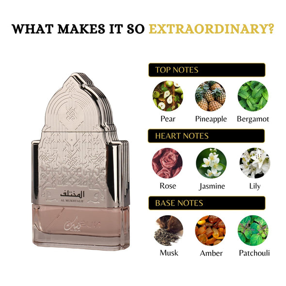 Discover the harmonious blend of fresh fruits and delicate florals with AL MUKHTALIF WOMEN EDP by NUSUK. This 100ml (3.4oz) perfume boasts top notes of pineapple, bergamot, pear, and melon; middle notes of jasmine, rose, and lily; and base notes of amber, patchouli, and musk. Experience a captivating fragrance that lasts throughout your day.