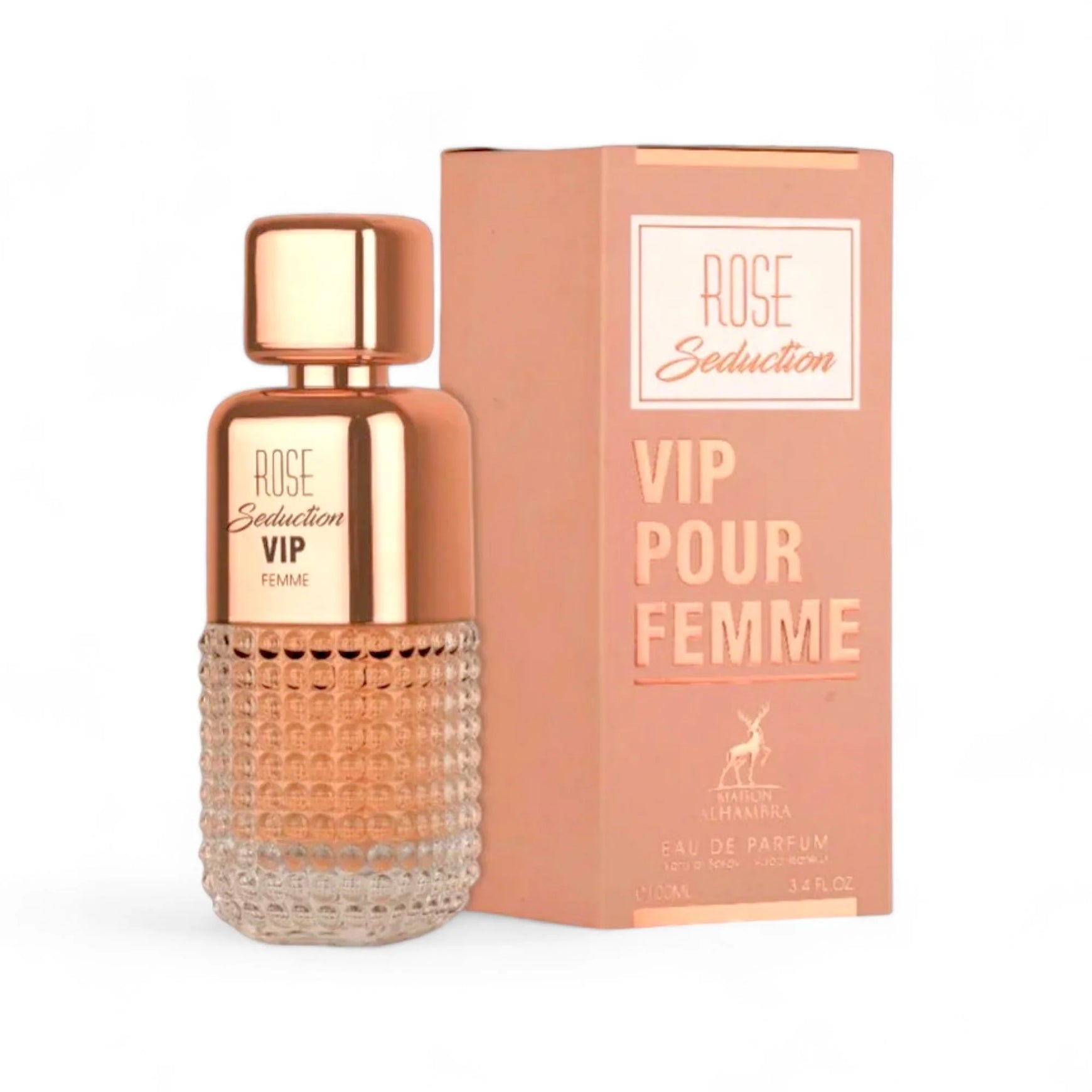 Experience the luxurious aroma of ROSE VIP FEMME WOMEN EDP- 100ML by Alhambra. A harmonious blend of Champagne Rosé, Pink Pepper, Peach Blossom, Rose, White Musk, and Woody Notes. Indulge in timeless femininity.